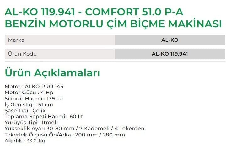 AL-KO 119.941 - COMFORT 51.0 P-A BENZİN MOTORLU ÇİM BİÇME MAKİNESİ