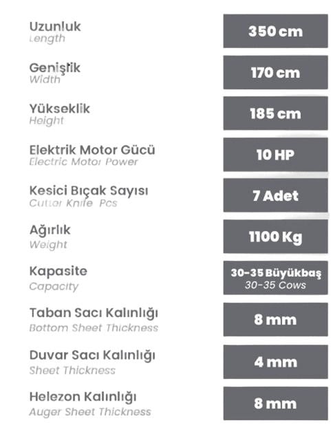 Bu özellikler, makinenin büyükbaş çiftliklerinde en yüksek verimlilikle kullanılmasını sağlar. Güçlü 10 HP elektrik motoru, yemlerin kısa sürede homojen bir şekilde karıştırılmasını sağlar. Ayrıca, 7 adet kesici bıçak, yemlerin ideal boyutta kesilmesini ve doğru oranlarda karışmasını garantiler. 1100 kg ağırlığındaki bu makine, sabit duruşu ve sağlam yapısı ile zorlu tarım koşullarında dahi uzun ömürlü kullanım sunar.
