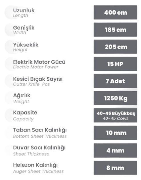 Bu özellikler, makinenin zorlu tarım koşullarına dayanıklı olduğunu ve büyük kapasitesi ile verimli bir kullanım sunduğunu göstermektedir. 15 HP’lik güçlü elektrik motoru, yemlerin kısa sürede homojen bir şekilde karıştırılmasını sağlar. Kesici bıçaklar ise yemlerin ideal boyutta kesilmesini ve karışmasını garantiler. 1250 kg ağırlığıyla bu makine, stabil ve dayanıklı bir yapı sunar.